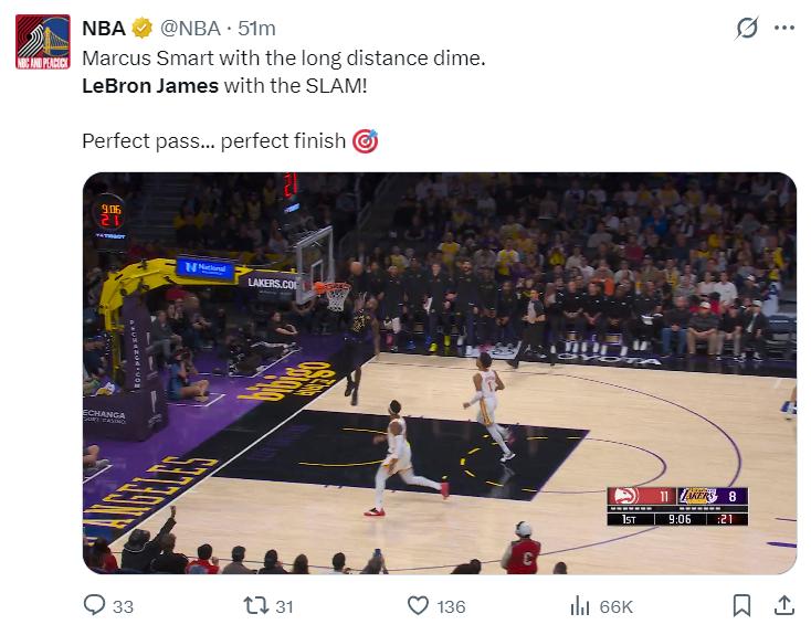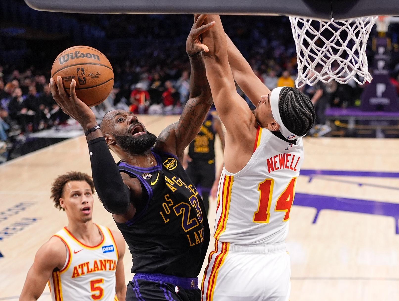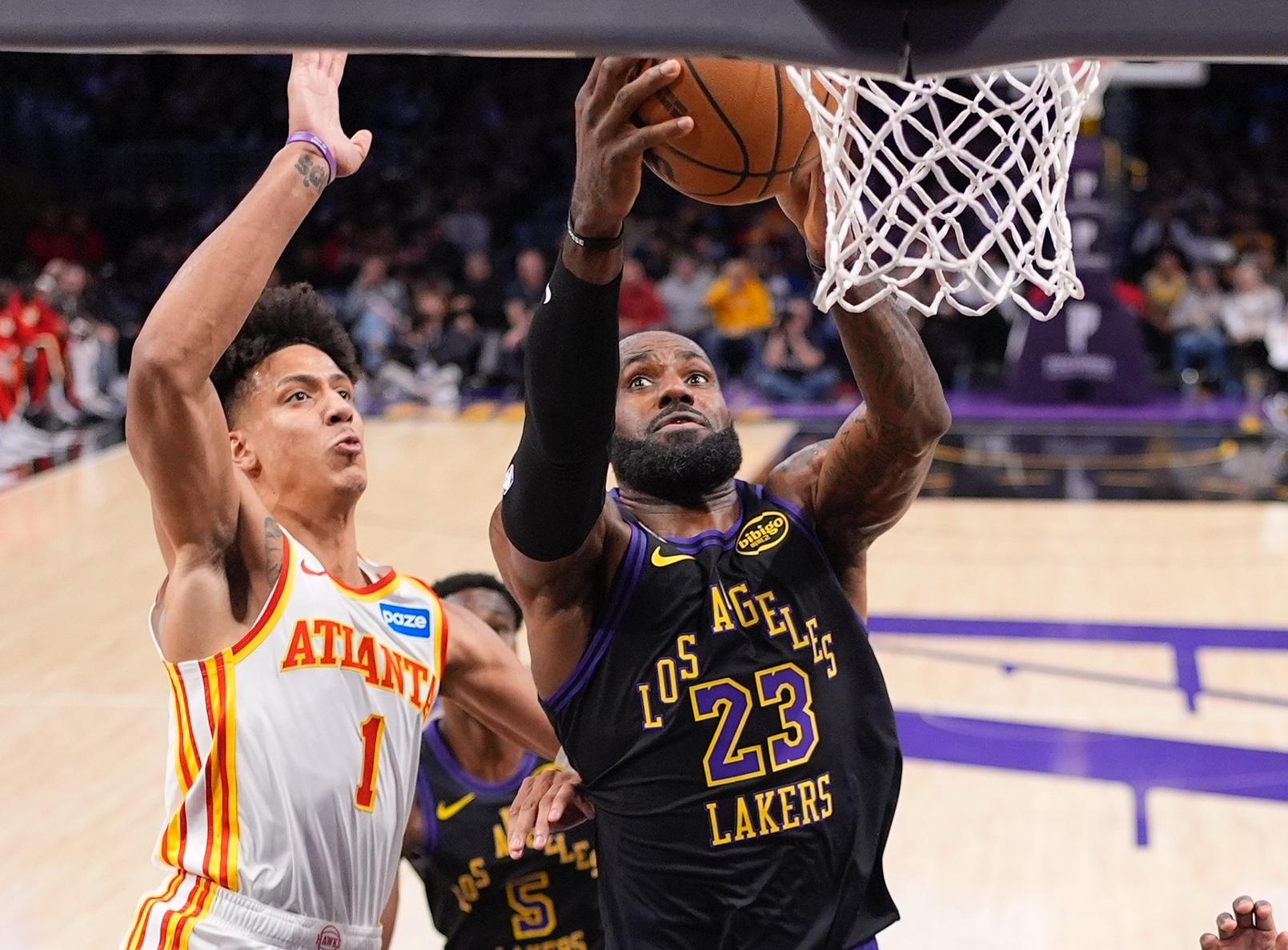 末节开场詹姆斯篮下单打古耶得手,想造古耶犯规没造成,詹姆斯一个低级失误但奥孔古空篮没扣进,詹姆斯飞了好远的暴扣,詹姆斯又制造一个犯规,詹姆斯大帽麦科勒姆一个随后助攻艾顿,詹姆斯空切完成30+,雷迪克换下末节12分的詹姆斯,詹姆斯只差1个篮板球就创造最年长的30+三双纪录,雷迪克不让他多打1分钟略显遗憾。